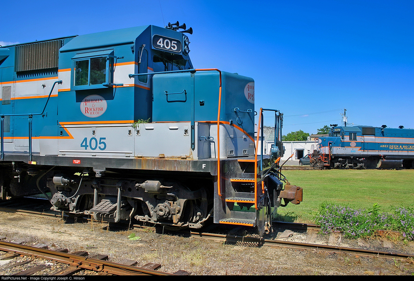 In May 2005, Aberdeen & Rockfish GP38s 405 and 400 rest over the weekend in the small North Carolina town of Raeford. They were parked at the interchange with the Laurinburg & Southern. AR 405 was buit in 1967 for the Eriie Mining Company while 400 was built one year later for the A&R.