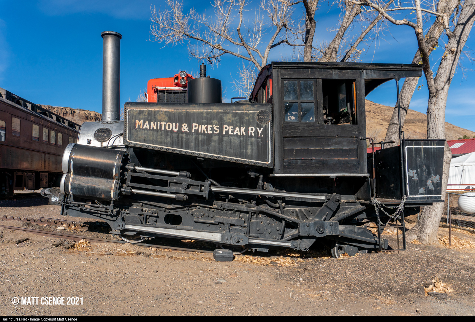 Manitou & Pikes Peak Railway 0-4-2T locomotive no. 1 (Baldwin Locomotive Works, 1890), originally named the John Hulbert, is seen on display at the Colorado Railroad Museum in Golden, CO. One of three locomotives originally built for the rack railway, no. 1 features a sloped frame that would allow the boiler to be level on a 16% slope!