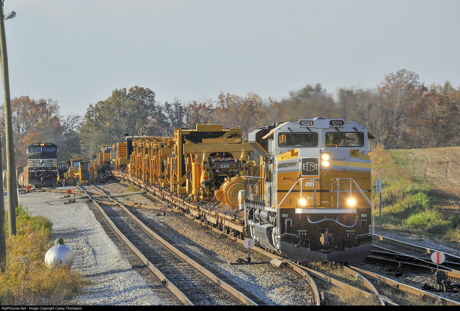 EMDX 1201, specially painted in Caterpillar colors, leads train 055 east out of the NS yard in Princeton, Indiana. This was a special one-time show for the SD70Ace demonstrator, which led the train all the way from the CAT factory in Peoria, Illinois, to the port in Savannah, Georgia, for export. NS used to run a dedicated train load of CAT's once a week, but nowadays whatever loads generated from the plant moves as part of one of the normal scheduled manifests.