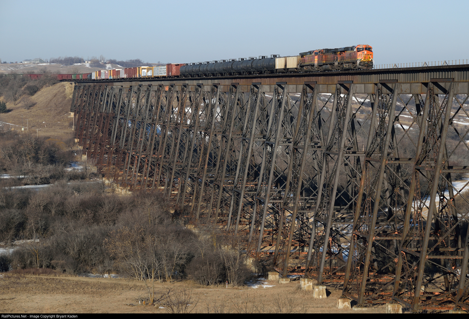 From this angle, the immense bridge over the Sheyenne River at Valley City, ND looks like a wall of steel. An eastbound BNSF train makes the crossing in March 2017.