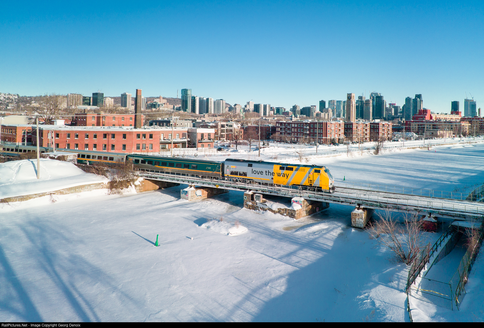 | On a sunny January morning VIA's P42DC no. 914 leads all-LRC Corridor train no. 22 into Montreal, crossing the Lachine Canal at Saint-Henri. |
