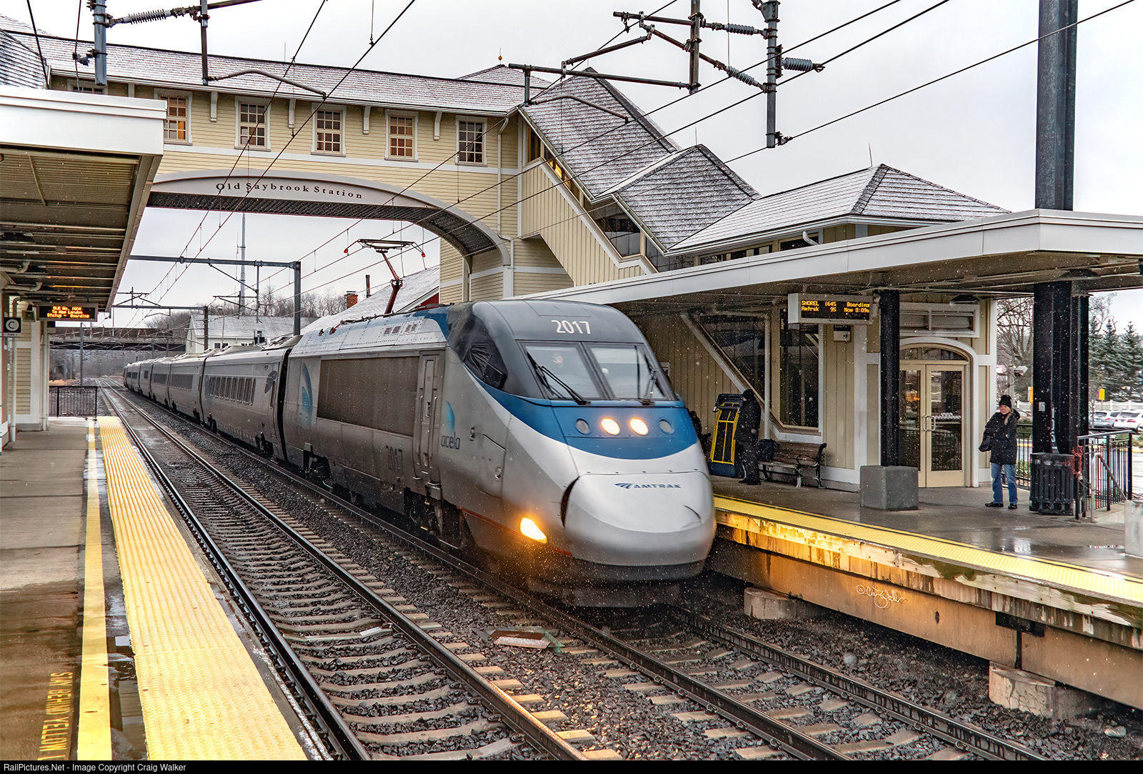 The Old Saybrook Station's signs are jumping the gun a bit, as it is not actually "boarding" time for the two CDOT Shoreline trains, as Amtrak Acela Express 2153, speeding from Boston to Washington DC, has to pass through first. Acela Power Cars 2017 (up front) and 2036 (on the rear) will whisk this six-car train through the snow flurries here in Connecticut, clearing Track 2 for CDOT train 1645 to arrive shortly. On this line, however, these trains cannot achieve their full high speed (150 mph [240 km/h] in a few areas, including nearby Rhode Island), as the average speed across Connecticut is less than half that at just 66 mph (106 km/h) - still faster than the Amtrak Northeast Regionals and the Connecticut Department of Transportation's trains, however. The next day I will see this same Acela trainset (Trainset 11) in Delaware. The passenger waiting on the opposite platform is, perhaps, perplexed by two people photographing this train … perhaps she's never seen a railfan before. (And many who have won't admit it.) I've looked online for his video, but cannot find it … yet. Perhaps he isn't as big an egotist as I am and doesn't post his work. (Old Saybrook, Connecticut – January 31, 2023)