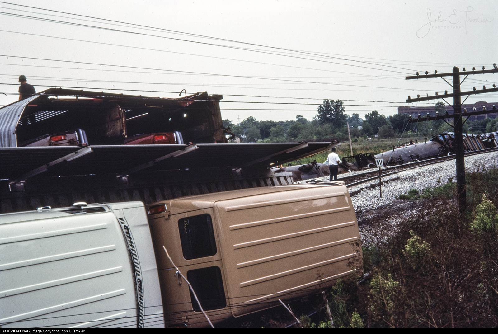 NS 183 derailment photo in Logansport, IN just east of 18th Street during July 1988. The derailment occurred due to 183 going into emergency when the head end was crossing the Wabash River over 1 mile west of this location. The emergency application was made due to trespassers who were walking on the bridge.