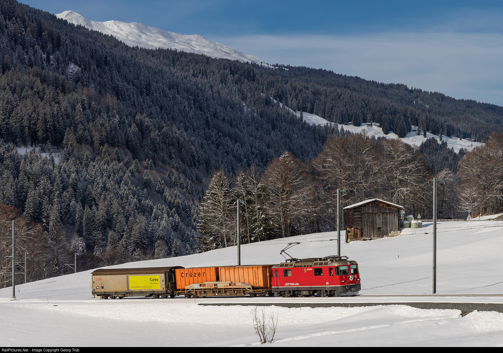 | Since the timetable change in December 2022, the new "Capricorn" trains with automatic coupling have been running on the Regio Express connection between Landquart and Scuol-Tarasp and vice versa. It is therefore no longer possible to add freight cars to passenger trains, as was previously the case on this route. A freight train now runs Monday to Friday from Chur via Landquart to Scuol-Tarasp and back for freight transport. Train 5225 with Ge 4/4 II 613 from Chur freight yard via Landquart-Klosters to Scuol-Tarasp is between Serneus and Klosters Dorf. |