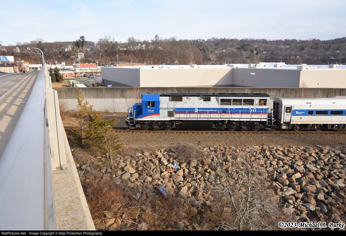 On a Sunday afternoon in Ansonia, Metro-North train 6930 is about to pass under Bridge St. as it heads toward Waterbury. The train is led by Brookville BL20GHM 111, which was recently overhauled at MotivePower Inc. (MPI) in Erie, PA, with a new Cummins prime mover and fresh paint.