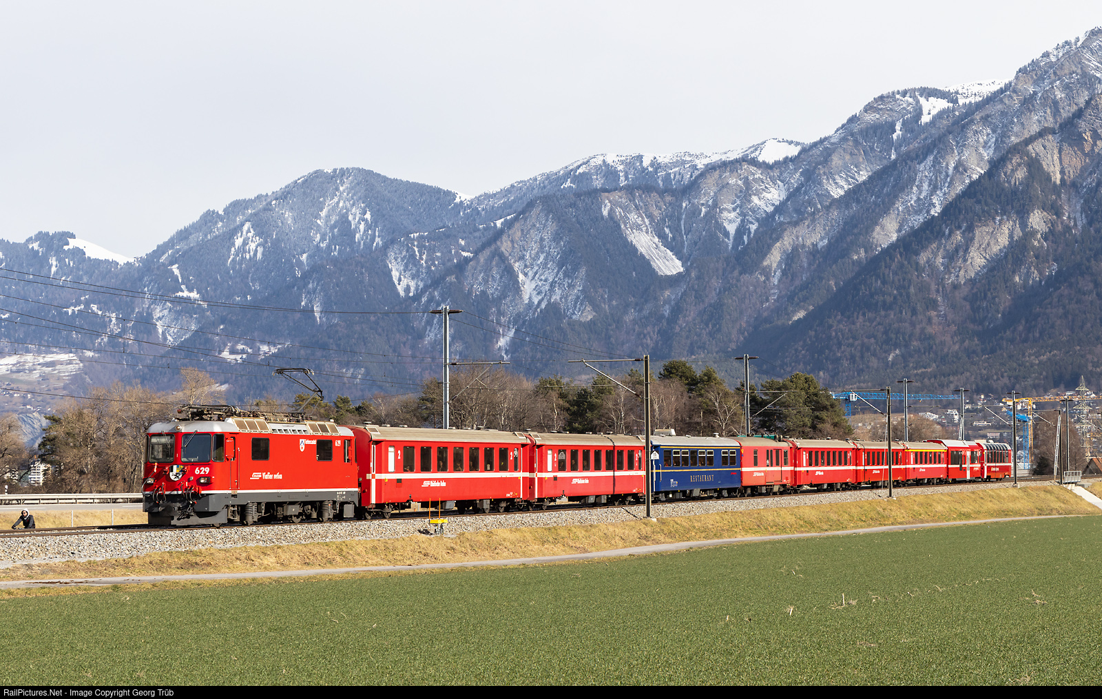 | Ge 4/4 II # 629 of the Rhaetian Railway is pulling the interesting consist of Interregio 1141 from Chur to St.Moritz, between Chur and Felsberg. This is the replacement train, reinforced in front with 2 second class standard cars type B II and the blue dinign car GOURMINO WR # 3815. In the very rear of the push-pull train is a second class panorama car. |