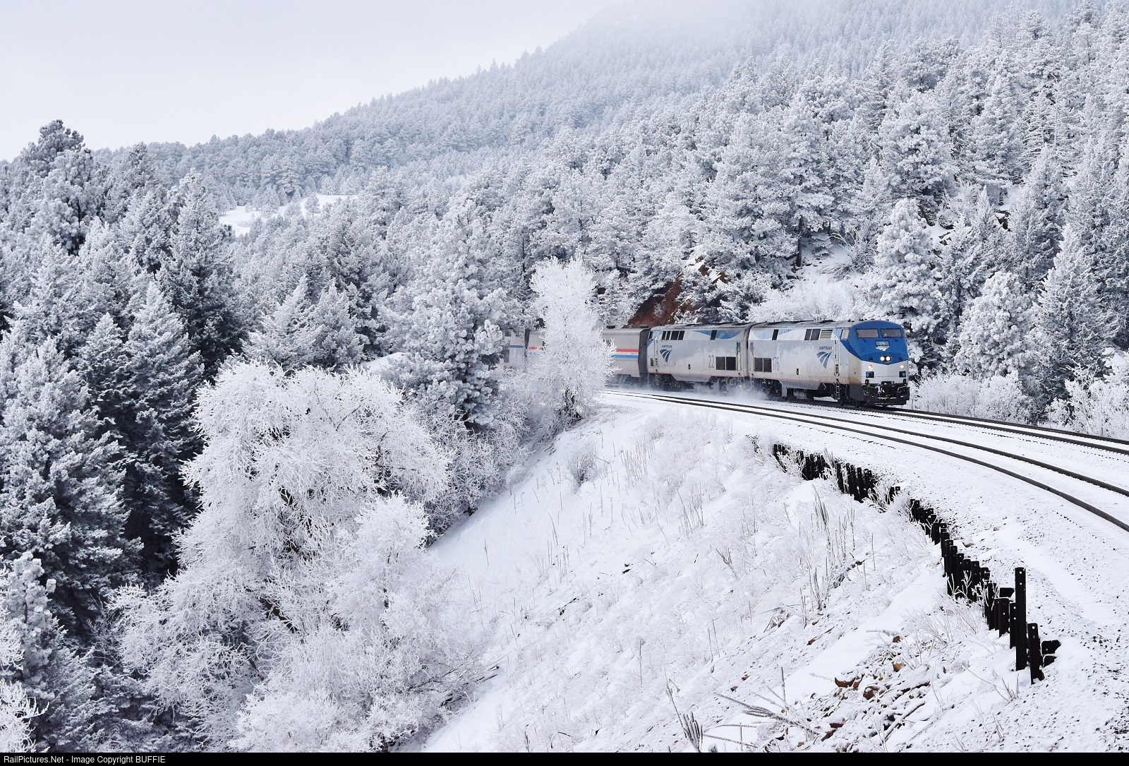 The California Zephyr runs through Plainview, Colorado after freezing fog and falling snow creates a winter wonderland on the Moffat Tunnel Sub.