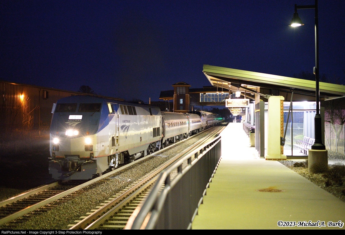 On the evening of Sunday, February 5, 2023, at the end of blue hour, Amtrak train 465 departs Wallingford Station. The shuttle set also has the disabled equipment of Vermonter train 57. Both trains and their passengers were combined in Springfield for the run to New Haven.