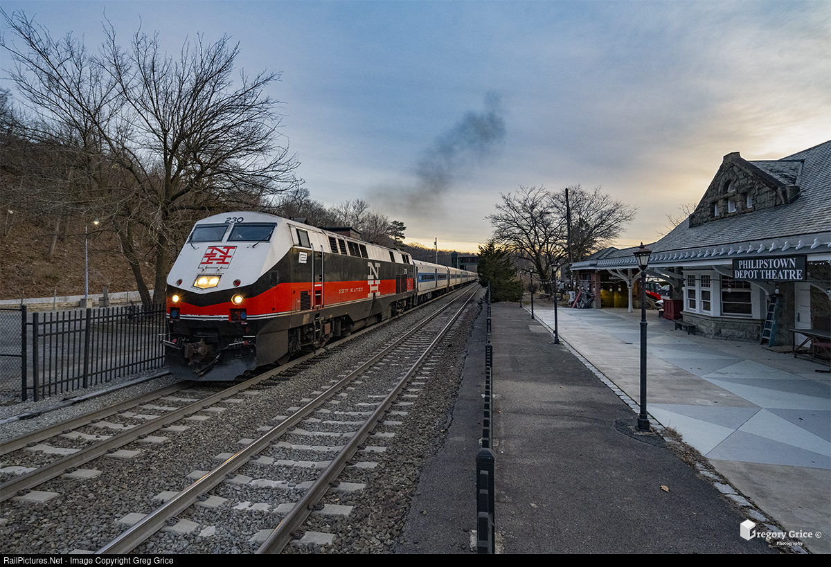 As the sun sets on February 5th, 2023, CDOT GE P32AC-DM #230 leads Metro-North train 8839 past the former New York Central Garrison Depot as it departs the current station while heading up the upper Hudson Line. 230 sports Penn Central Transportation Company decals paying homage to the now defunct company which ran service on the line before it was eventually taken over Metro-North.