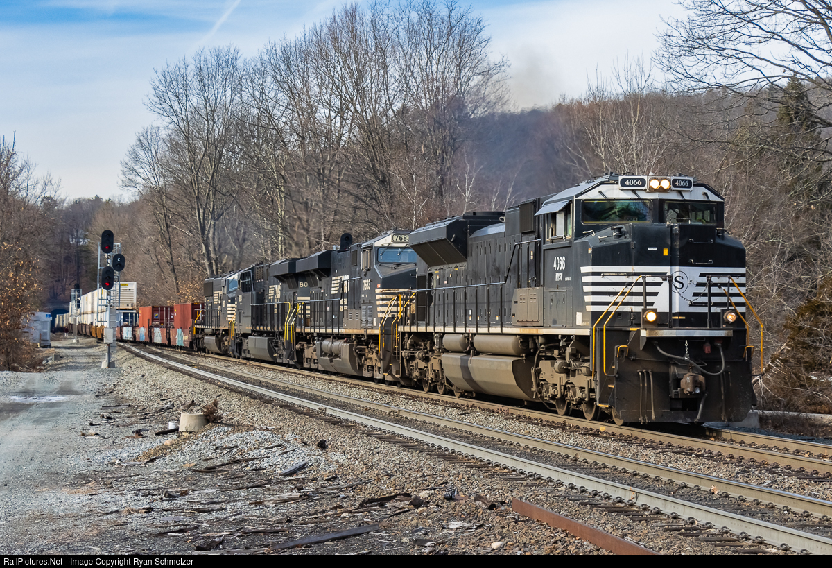 NS 28X, running as the NYSW SU-100, exits the Otisville tunnel and splits the signals at it approaches the Otisville Metro-North station. Due to a major Norfolk Southern derailment in Ohio several NS trains are being routed onto other railroads to reach their destinations. NS 28X was the first train to detour via the NYSW between Binghamton, NY and Jersey City, NJ.