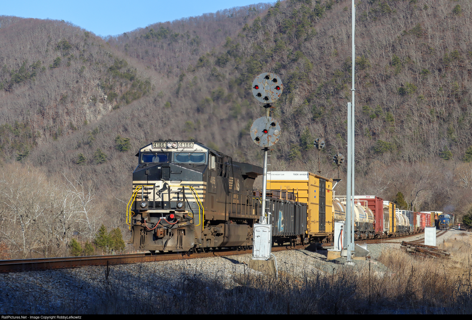 The Rear DPU of NS 12Z knocks down the N&W CPLs at Arcadia, Virginia, as the train meets an incoming southbound 11Z, who was sitting in the siding. If you look closely at the right side of the frame, NS 8103, the N&W Heritage Unit, is visible next to the famed N&W CPLs leading 11Z.