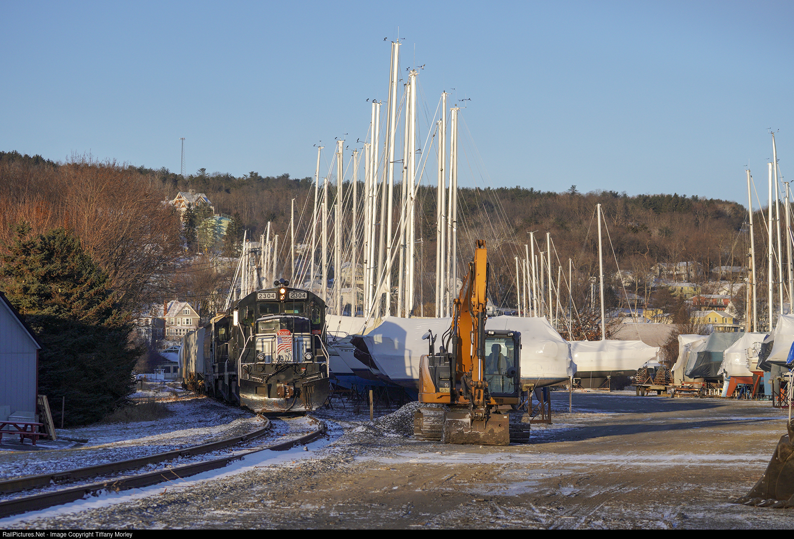 Finger Lakes Railway passes the sailboats in freezing cold at the bottom of Seneca Lake with a train for Cargill.