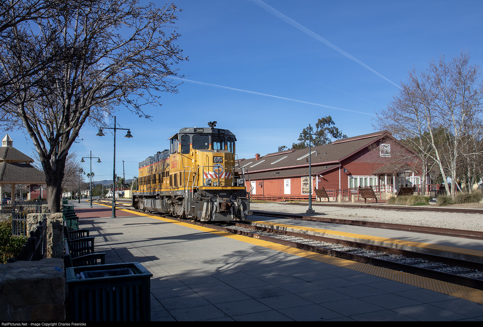 | Drove up to Santa Paula, California this past Saturday (2/5/23) to see if there was a clean shot of the Sierra Railway RP20GE (SERA 2666). It was parked next to a tree, so no perfect roster for me.... but still a cool scene. |
