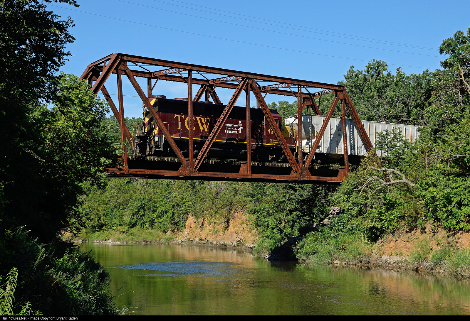 On a beautiful summer morning, the Twin Cities & Western is moving some grain loads east on the former Minneapolis & St Louis Railway behind a single locomotive, seen crossing the Redwood River at North Redwood, MN.