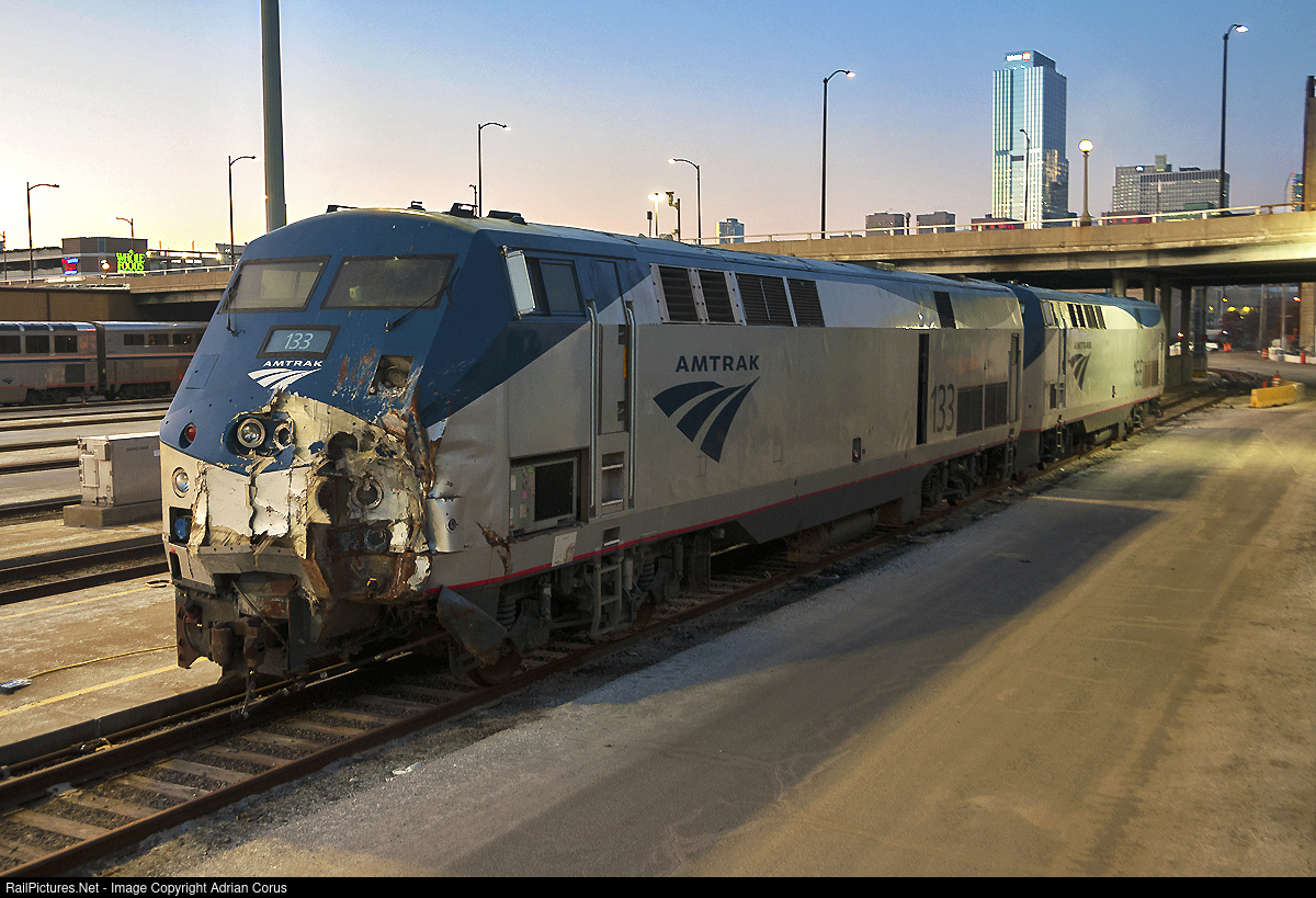 | Amtrak P42DC 133 is seen pretty banged up in Chicago after it struck a cement truck while leading the Southwest Chief back in June, 2022. The crash derailed the entire train killing 4 people. Amtrak 166 was trailing on the day of the crash and has been paired with 133 ever since. Not sure exactly what the fate is for this unit. |