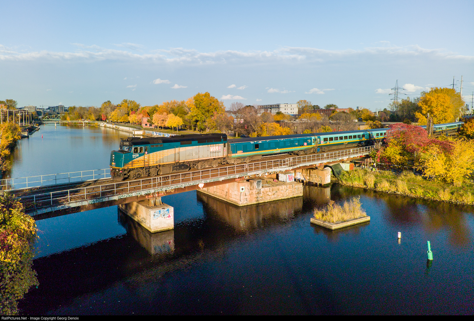 VIA's F40PH no. 6428 has a Renaissance set in tow as it is making its way over the Lachine Canal in Montreal's Saint-Henri neighborhood on a sunny mid-October day surrounded by beautiful fall colors.