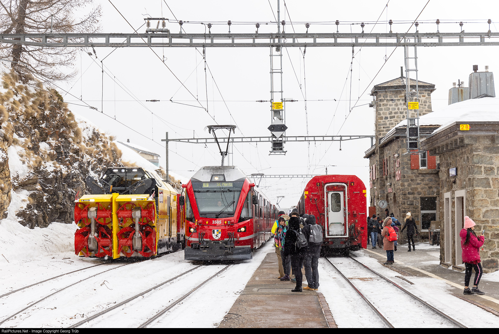 "Full house" on Alp Grüm station of the Rhaetian Railway (Bernina line). On the right, on track 1 seen from the rear is BERNINA EXPRESS PE 951 from Chur to Tirano, which has a longer sightseeing stop of about 1/4 hour. On track two, entering the station is regional train 4640 from Tirano to St.Moritz with "Allegra" ABe 8/12 # 3505. On the left, on the short track 3, is the "Zaugg" snow blower Xrot mt # 95403 with diesel/electro locomotive Gem 4/4 # 802, the snow fighting composition from Poschiavo.