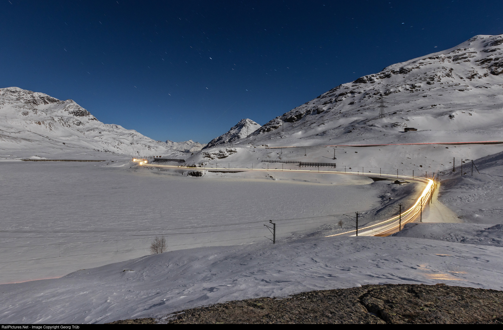 | Under the light of the almost full moon, the last passenger train of the day from St.Moritz to Poschiavo draws a light trail on its journey over the Bernina pass along the frozen and snow-covered Lago Bianco, at about 2250 meters above sea level. The "Allegra" ABe 8/12 # 3505 is running the service on this day. A 132 second long exposure in extremely cold conditions near Ospizio Bernina. |