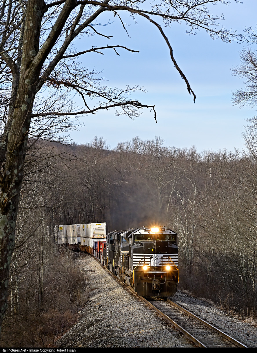 | Norfolk Southern 28X detoured over the New York Susquehanna & Western due to a major derailment in East Palestine, OH. The train carried the symbol SU100X while on the NYS&W, and one of their former NS SD70M-2s was added to the head end for the run between Binghamton and North Bergen. The train is nearing the top of the Sparta Mountain grade in Stockholm just east of Beaver Lake. |