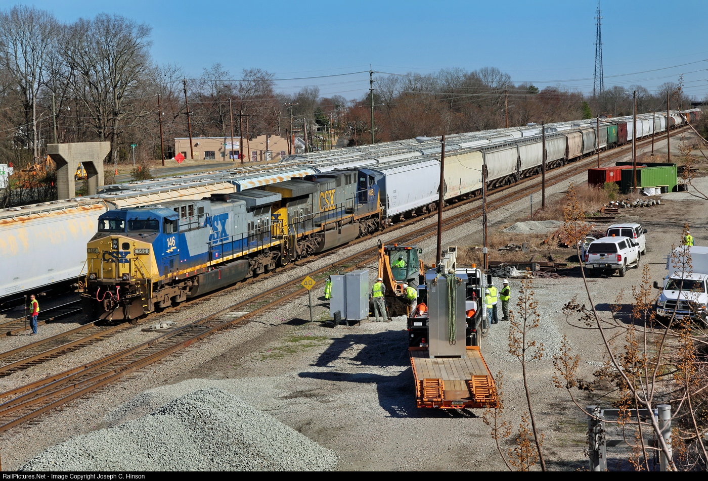 While a Maintenance of Way gang prepares to get a move on, a local train has just pulled in the yard with two big GE motors up front. CSX 146 was a AC44CW bult in 1996.