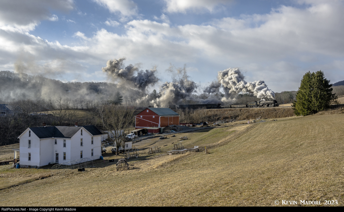 Steamscape: The Helmstetter Farm. One of the most iconic railfan photo spots in the eastern United States has to be this location right here. Spotted in the center of a big, sweeping, horseshoe curve, is the farm that was for decades owned by the Helmstetter Family, for which this curve is officially named. The property has recently changed hands, but it is still a working farm, complete with cattle and poultry, which roam the grounds. This location is famous for scenes featuring big, Western Maryland 4-6-6-4 Challenger Locomotives hauling coal drags up the Connellsville Subdivision along what used to be a double-track line. Interestingly, the fill you see which supports the railroad was originally built as wooden trestle, which was filled in with the rock and soil excavated to bore the Brush Tunnel, just one mile west of here. Although eventually abandoned by the Western Maryland as a freight line in 1975, this trackage is still used today as a tourist line, by what's now called the Western Maryland Scenic Railroad. In this scene, we see that line's recently-restored C&O Locomotive #1309, a 2-6-6-2 compound articulated Mallet engine, hauling a photo freight for a February, 2022 Lerro Photography Charter. Although not nearly as large as the big Challengers that used to ply this line, it is a fitting tribute to the history of this place and the part it played in the building of American industry.
