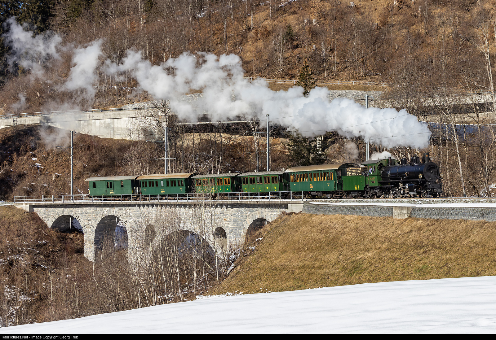 | This day, the 2-8-0 "Consolidation" steamlocomotive G 4/5 # 107 "ALBULA" of the Rhaetian Railway had to pull the empty passenger train 9043 from Landquart via Klosters to Davos Platz, for movie filming the following day. The nice twoaxle cars train is crossing the 52 meter long and 13 meter high Reutlandtobel bridge at Pagrüeg, between Saas im Prättigau and Serneus. The bridge was built in 1889 as a truss bridge and rebuilt with a stone arch in 1910. The G 4/5 # 107 was built by the SLM in 1906.