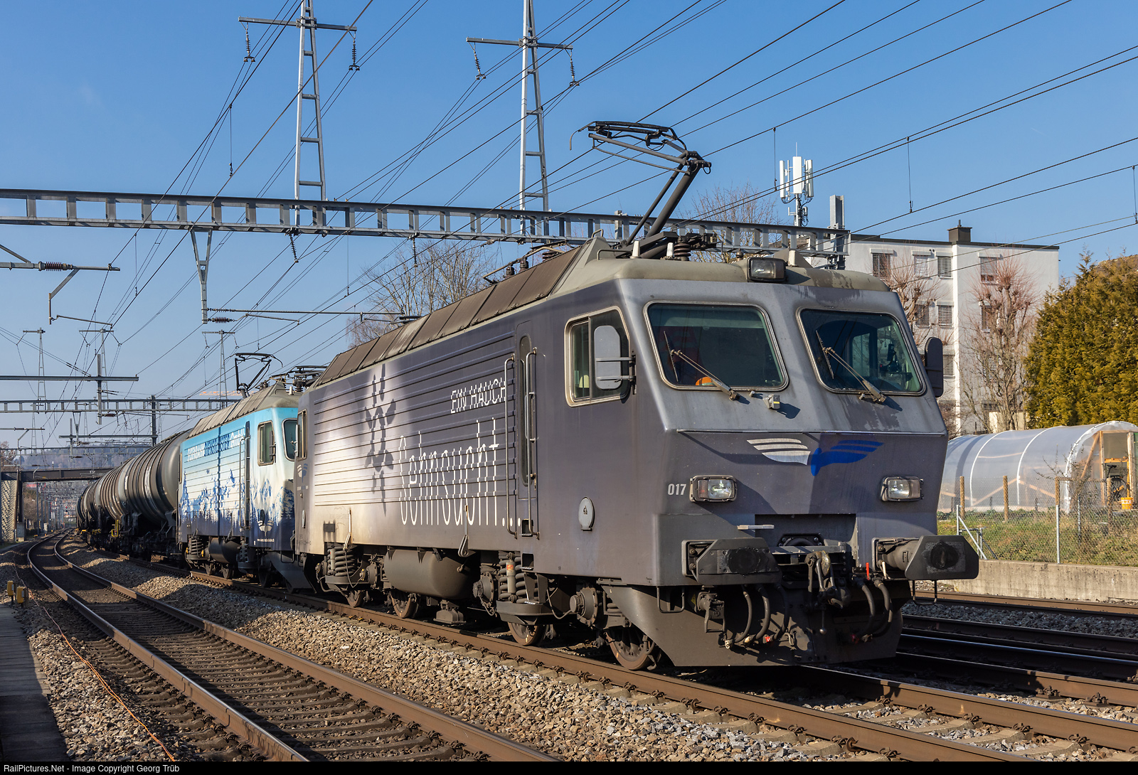| The former SBB Re 4/4 IV, then Südostbahn (SOB) and now Eisenbahndienstleister Gmbh (EDG) Re 446 # 017 and # 018 in multiple control are pulling the about 1800 ton gasoline train 44661 from Grosskorbetha/Germany via Basel-Bözberg-Regensdorf-Kloten-Wil SG to Bettwiesen (Tägerschen fuel depot), between Winterthur and Winterthur Grüze. The locomotives were in charge from Basel shunting yard. |