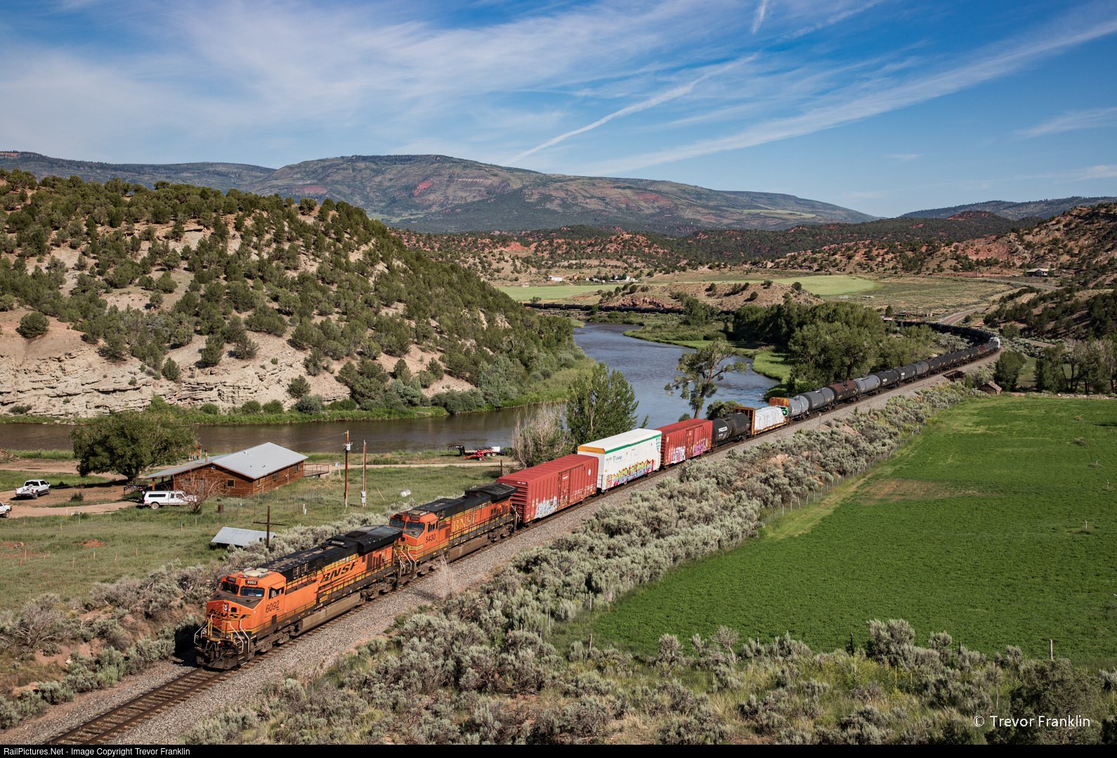 | The tail end of BNSF's Denver-Provo manifest rolls through the bucolic countryside on the Dotsero cutoff just west of bond, wasting no time as they twist and turn along the winding Colorado River. |