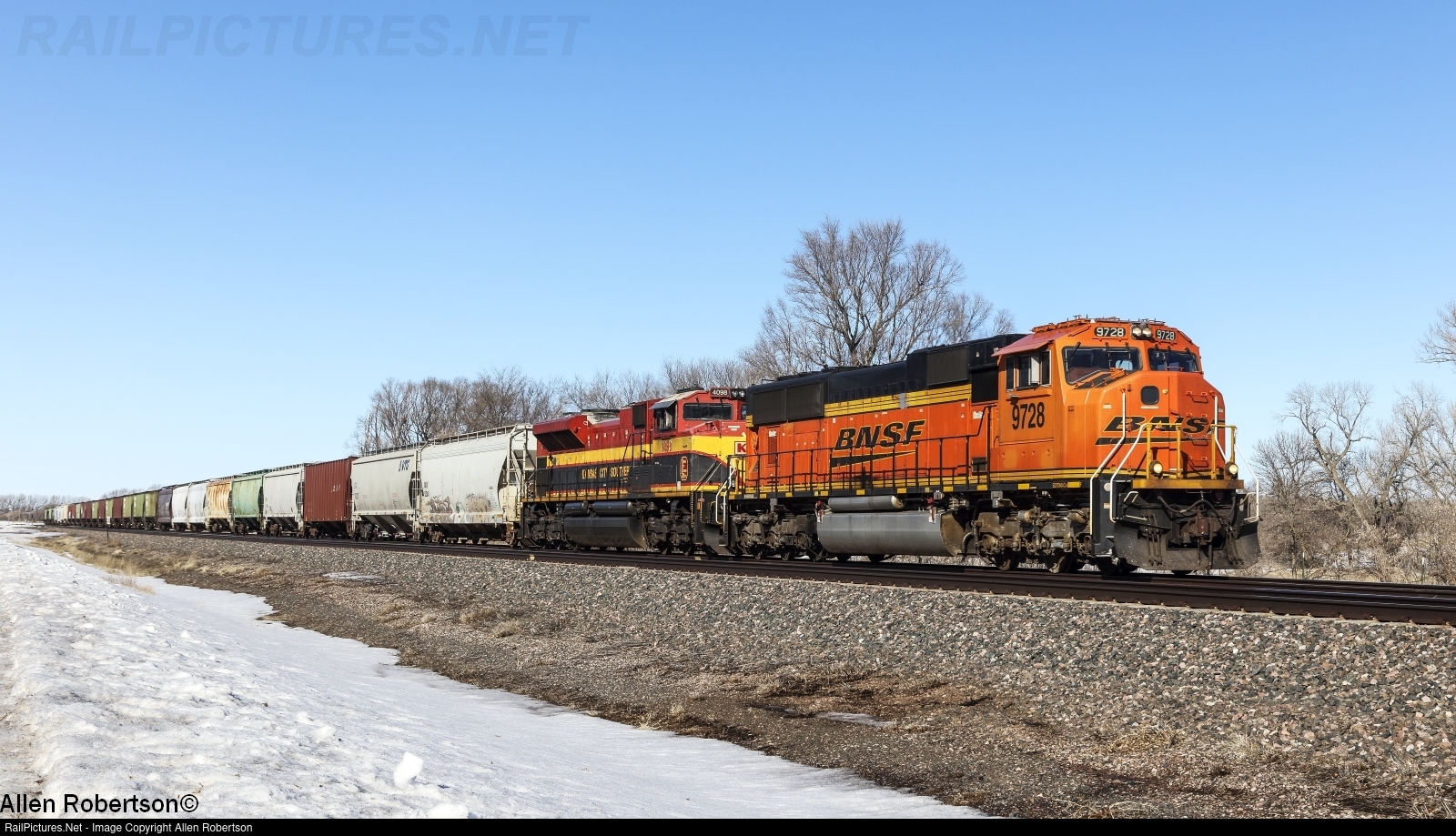 BNSF 9728 & KCS 4098 lead an eastbound manifest.