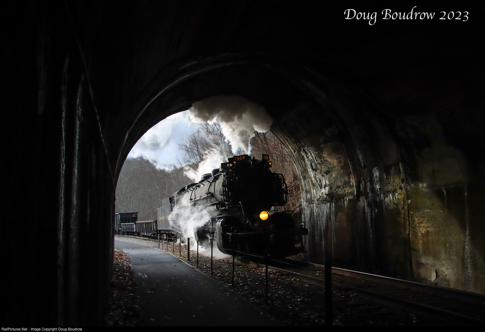 Chesapeake & Ohio 1309 is an H-6 "Mallet" with a wheel configuration of 2-6-6-2. It was built by the Baldwin Locomotive Works in 1949 to haul coal from the fields in West Virginia. It only served seven years until it retired in 1956 as the railroad transitioned to diesel locomotives. The locomotive sat on display at the B&O Railroad Museum in Baltimore until being acquired by the Western Maryland Scenic Railway and returned to service in 2021. Normally the locomotive sports the Western Maryland fireball logo but it was changed into the original C&O paint for a series of Lerro Photography charters in February 2023. The train is seen entering the 1911 built 914 foot Brush Tunnel near LaVale.