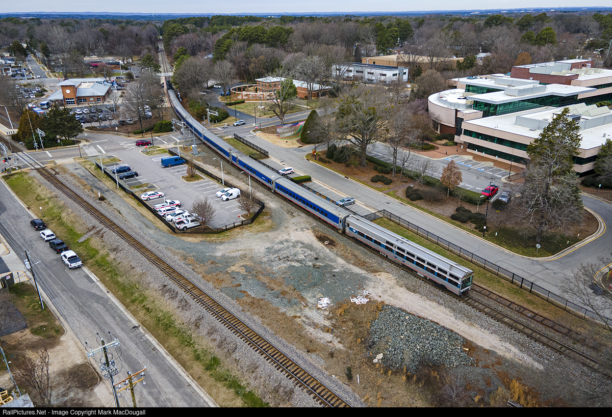 The American View inspection car brings up the rear of Amtrak 75 arriving in Cary.