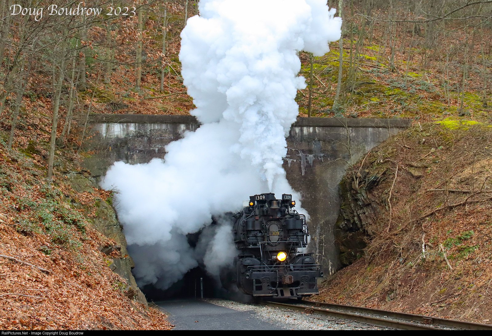 | Chesapeake & Ohio 1309 is an H-6 "Mallet" with a wheel configuration of 2-6-6-2. It was built by the Baldwin Locomotive Works in 1949 to haul coal from the fields in West Virginia. It only served seven years until it retired in 1956 as the railroad transitioned to diesel locomotives. The locomotive sat on display at the B&O Railroad Museum in Baltimore until being acquired by the Western Maryland Scenic Railway and returned to service in 2021. Normally the locomotive sports the Western Maryland fireball logo but it was changed into the original C&O paint for a series of Lerro Photography charters in February 2023. The train is seen exiting the 1911 built 914 foot Brush Tunnel near LaVale. |