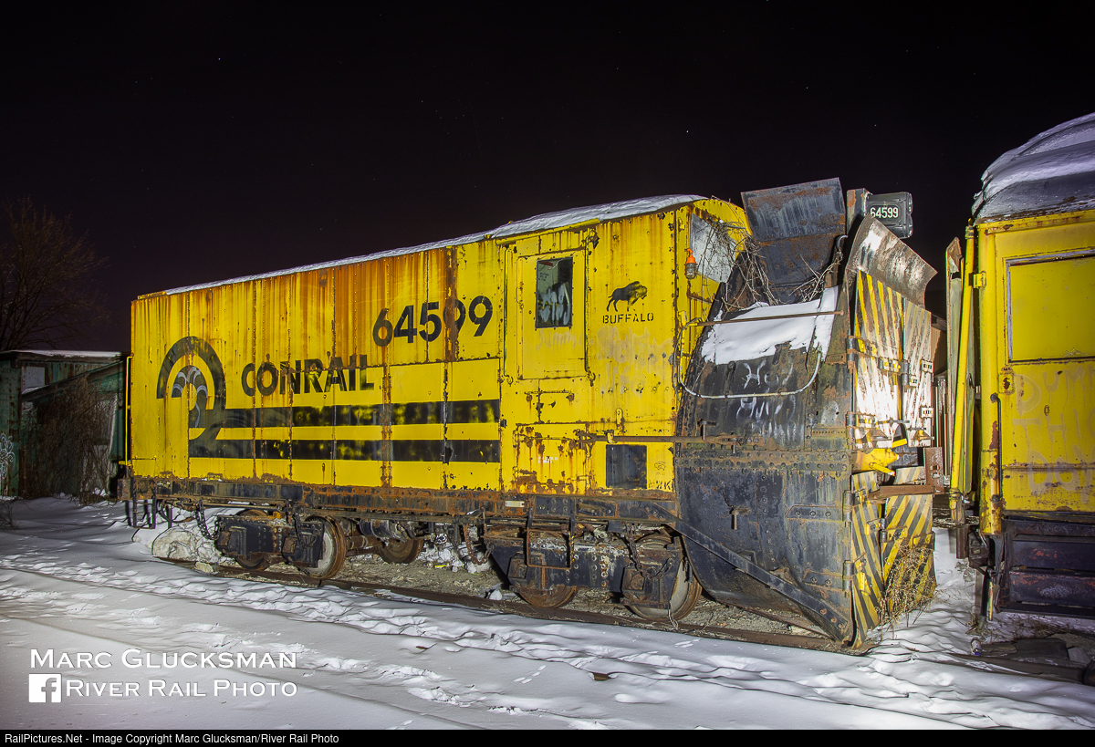 Vintage Rotary. What would ultimately become Conrail 64599 was built by the Cooke Locomotive and Machine Works of Paterson, New Jersey in coordination with Leslie Brother in January 1889 for the Rome, Watertown & Ogdensburg Railroad (RW&O). After the RW&O was purchased in 1891 by the New York Central & Hudson River Railroad, it was renumbered as X-659, later NYC X-659, and Penn Central 60021. Originally steam powered, the plow was subsequently converted to electric in 1951 and overhauled by Conrail again in 1978. Last used during the winter of 1993-1994, it was retained under CSX ownership and donated to the Western New York Railway Historical Society in 2003. On the night of February 3, 2021, it sits in Hamburg, New York at one of the Society's storage areas as a silent witness to the recent snowfall.