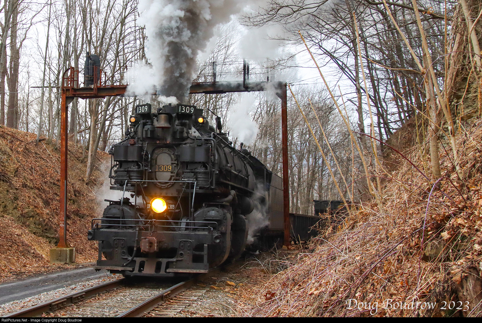 | Chesapeake & Ohio 1309 is an H-6 "Mallet" with a wheel configuration of 2-6-6-2. It was built by the Baldwin Locomotive Works in 1949 to haul coal from the fields in West Virginia. It only served seven years until it retired in 1956 as the railroad transitioned to diesel locomotives. The locomotive sat on display at the B&O Railroad Museum in Baltimore until being acquired by the Western Maryland Scenic Railway and returned to service in 2021. Normally the locomotive sports the Western Maryland fireball logo but it was changed into the original C&O paint for a series of Lerro Photography charters in February 2023. The train is seen at the Western Maryland Railway signal bridge just East of Trimble Road. |