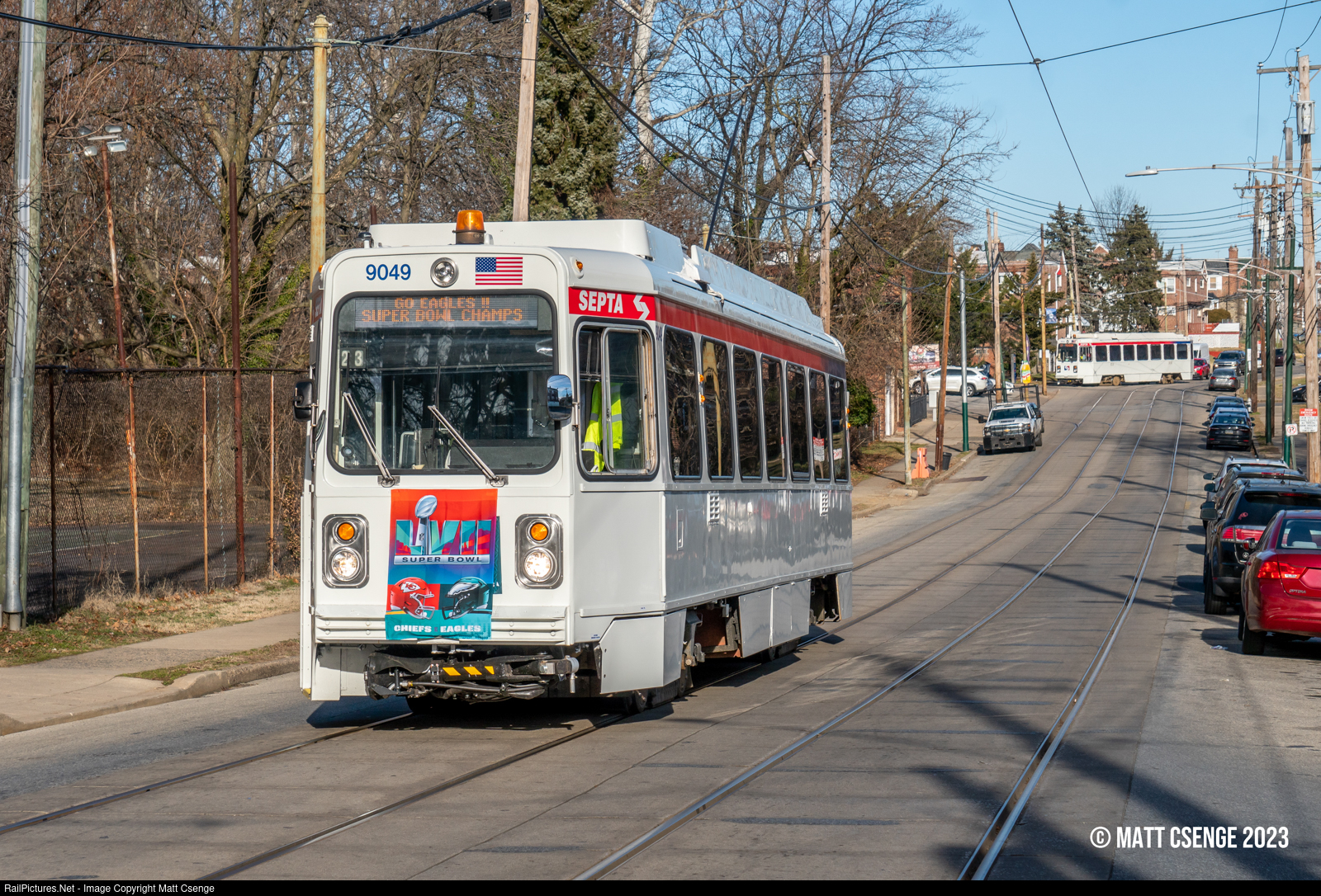 Southeastern Pennsylvania Transportation Authority (SEPTA) Type K LRV no. 9049 (Kawasaki, 1981-1982) is seen on Chester Ave in Yeadon, PA, while a Route 13 trolley turns into the Yeadon Loop in the background. The car is decorated for a photo charter on the weekend of Super Bowl LVII, which the Philadelphia Eagles are playing in - the route sign is a bit optimistic!