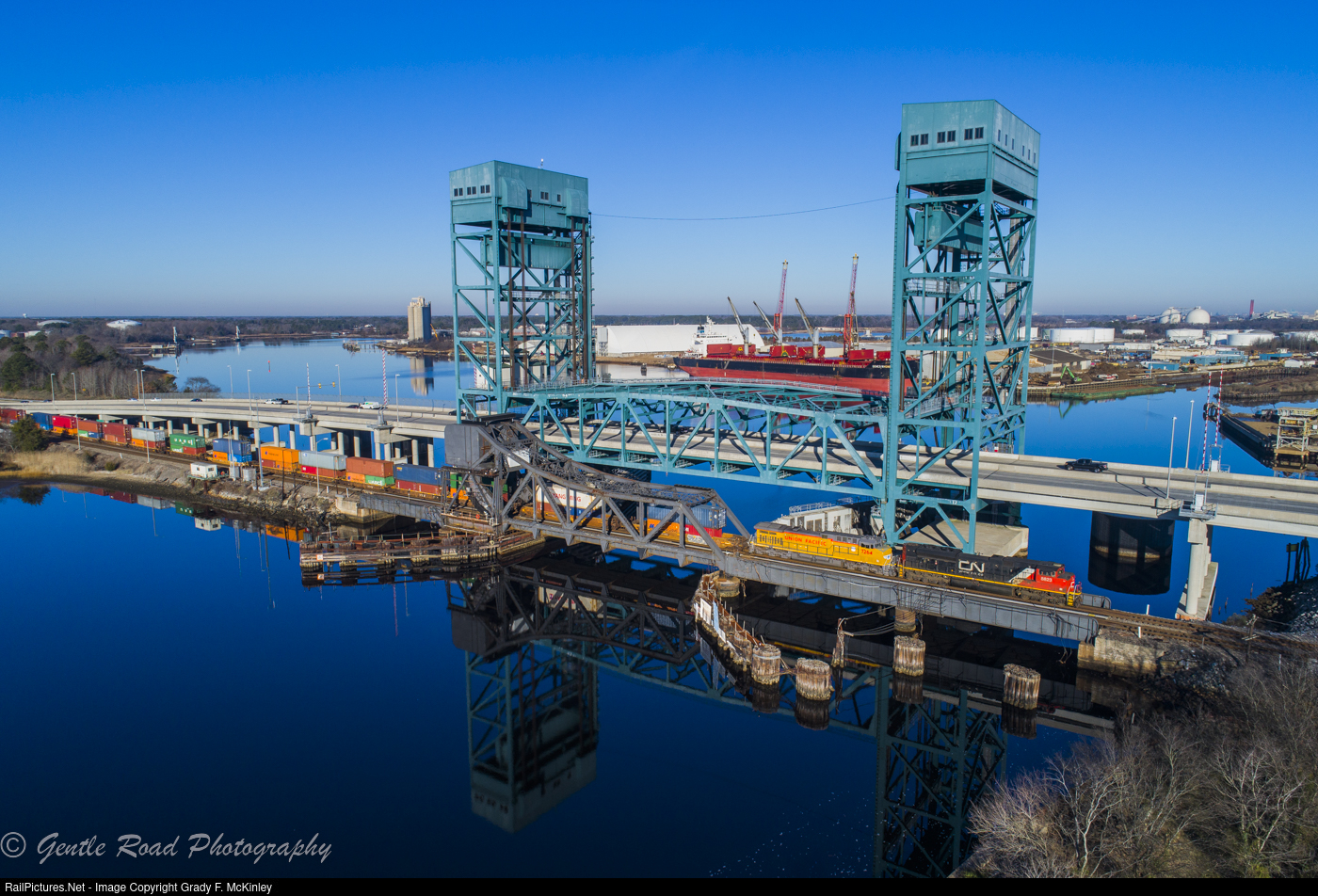 | NS 276 crosses Bridge 7 behind CN #8823 leading the way. The massive Gilmerton Bridge dominates the landscape in Chesapeake, VA where the NS crosses the southern branch of the Elizabeth River. |