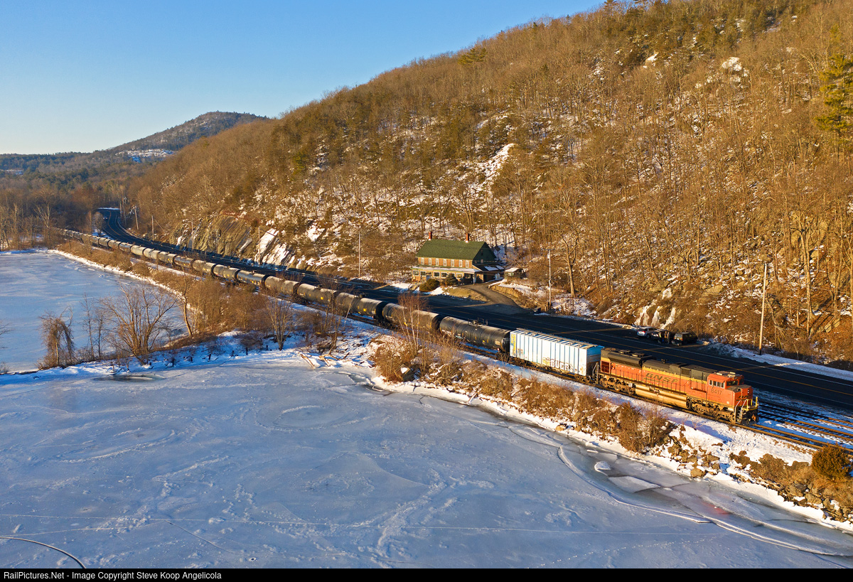 | Canadian Pacific loaded ethanol train 528 catches some early morning light along Lake Champlain at Ticonderoga, NY. CP 8007 and BNSF 8417 rear DPU. |