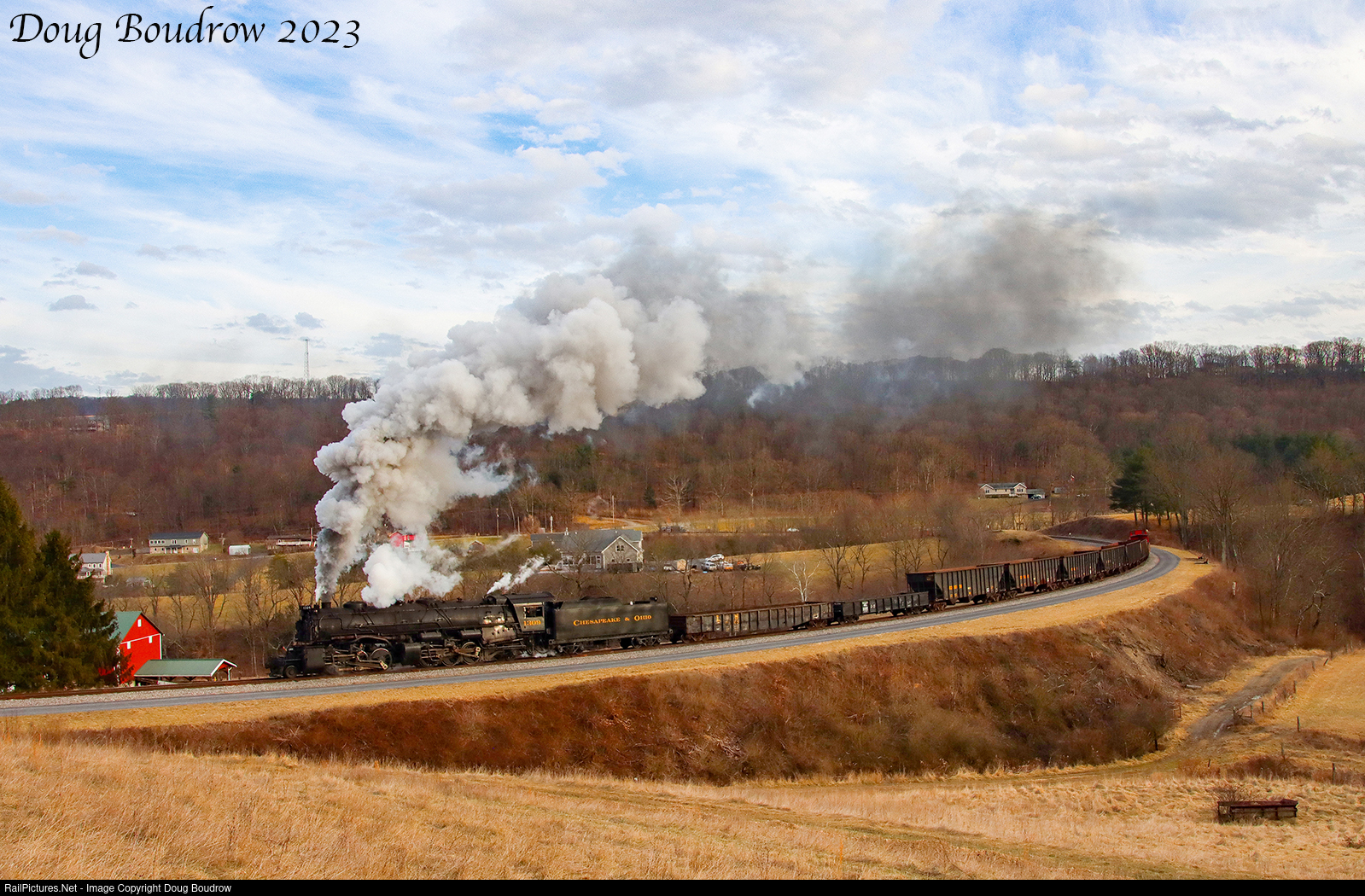| Chesapeake & Ohio 1309 is an H-6 "Mallet" with a wheel configuration of 2-6-6-2. It was built by the Baldwin Locomotive Works in 1949 to haul coal from the fields in West Virginia. It only served seven years until it retired in 1956 as the railroad transitioned to diesel locomotives. The locomotive sat on display at the B&O Railroad Museum in Baltimore until being acquired by the Western Maryland Scenic Railway and returned to service in 2021. Normally the locomotive sports the Western Maryland fireball logo but it was changed into the original C&O paint for a series of Lerro Photography charters in February 2023. The train is seen at Helmstetter's Curve, named for the Helmstetter Farm. This location is arguably the most famous on the railroad. |