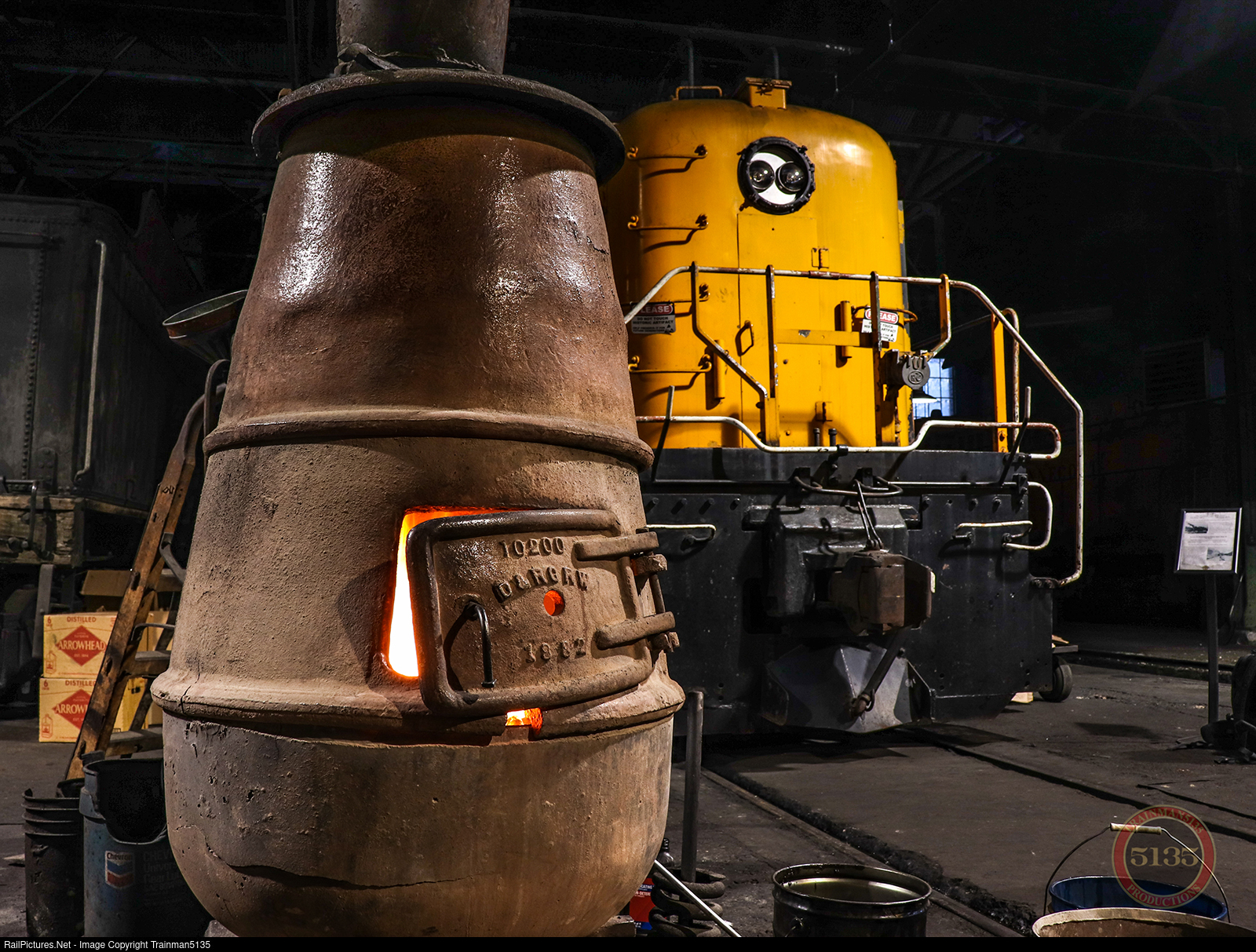 | The main engine house at the Nevada Northern is only heated by the steam from warming locomotives and this coal fired stove. In the perfect encapsulation of the railroad, the stove was apparently purchased used from the D&RG at some point in the 1920s. Behind the stove is newly returned Alco RSD-4 #201. |