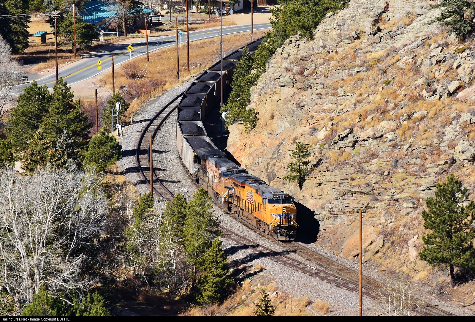 UP 8216 (ES44AC) leads a load of coal around the bend at Pinecliffe, Colorado as it makes the journey from the Continental Divide to Denver on the Moffat Tunnel Sub.