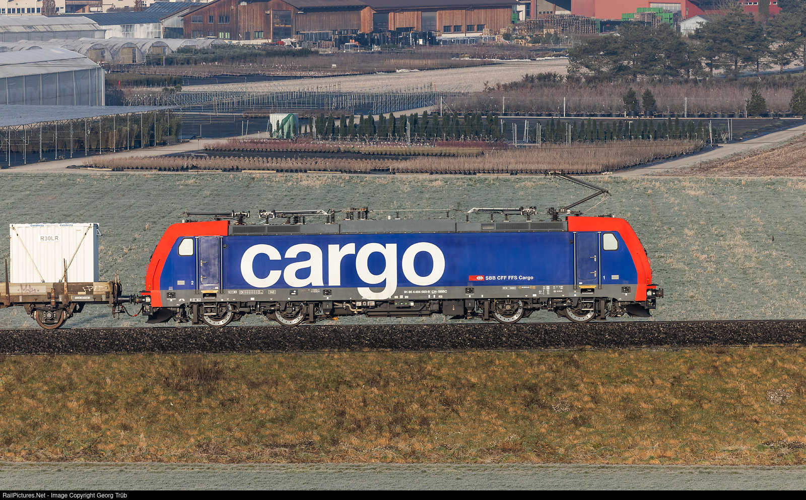 | Bombardier TRAXX F140 MS Re 484 # 003 of the SBB is pulling the freighttrain 44612 from the Limmattal shunting yard (RBL) via Bülach-Schaffhausen to Singen (Hohentwiel) (-Kornwestheim) between Rafz and Lottstetten. |