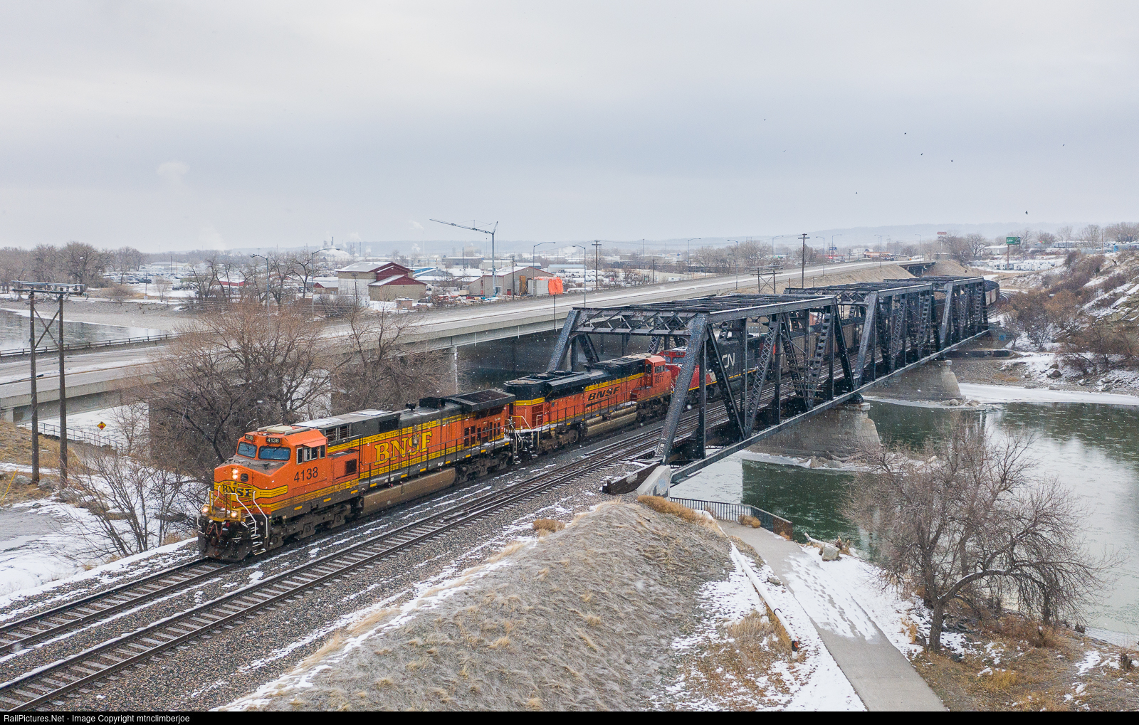 | A light snow flurry falls through the air on a March morning in Billings, Montana as a loaded coal train crosses the Yellowstone River on the MRL's 1st Subdivision. A BNSF crew is taking the train towards the yard in Laurel where the train will be recrewed by an MRL crew for the journey west. |