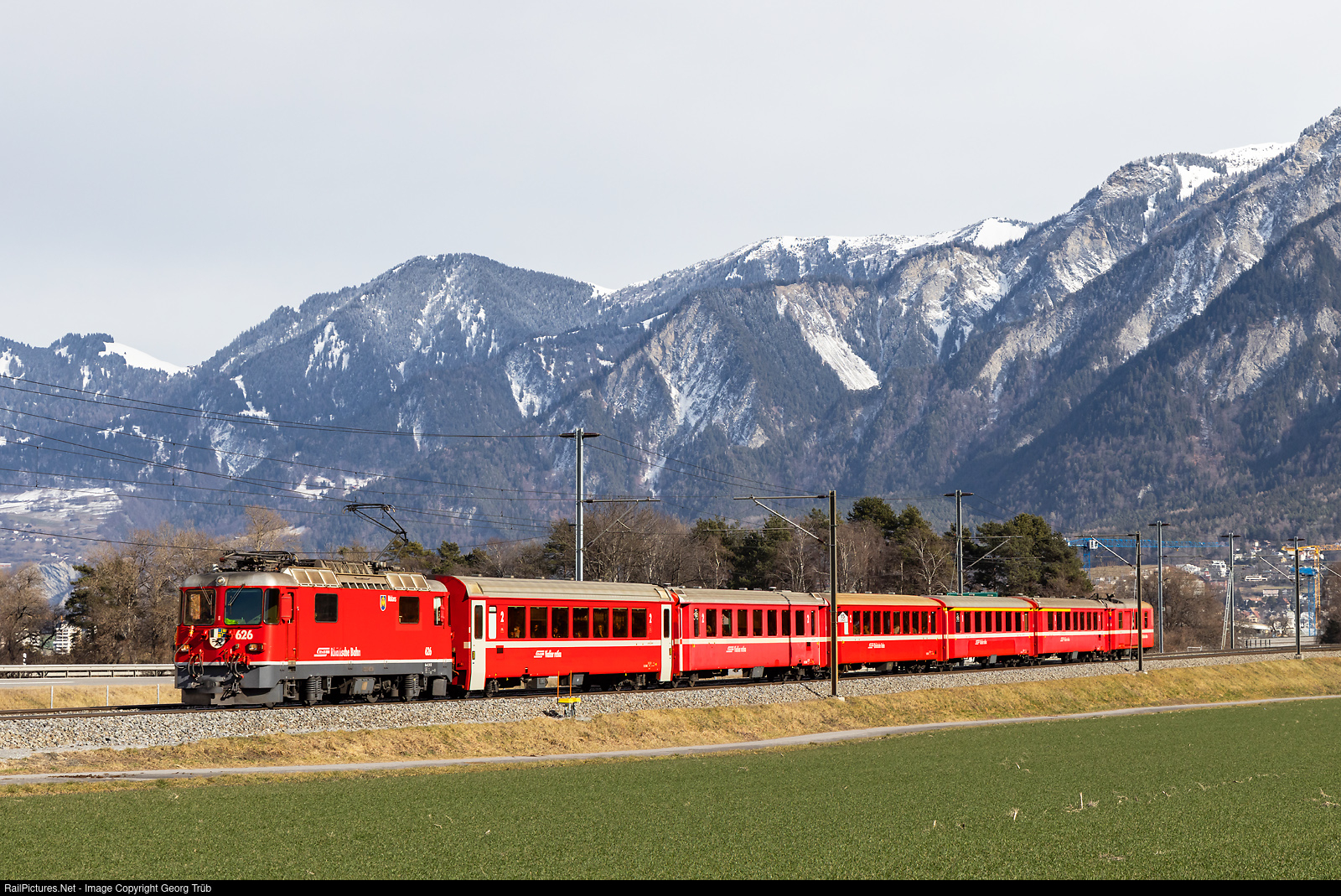 Ge 4/4 II # 626 "Malans" of the Rhaetian Railway is pulling the Regio Express 1741 from Chur via Reichenau-Tamins-Ilanz to Disentis/Mustér, between Chur and Felsberg. The consist is: Second class standard car type B IV, second class standard car type B II, second class standard car type B I, first class standard car type A I, mixed first and second class standard car type AB II (rebuilt), baggage car D (former DS). This RE trains between Chur and Disentis and vice versa will be changed to "Capricorn" trainsets till december 2023.