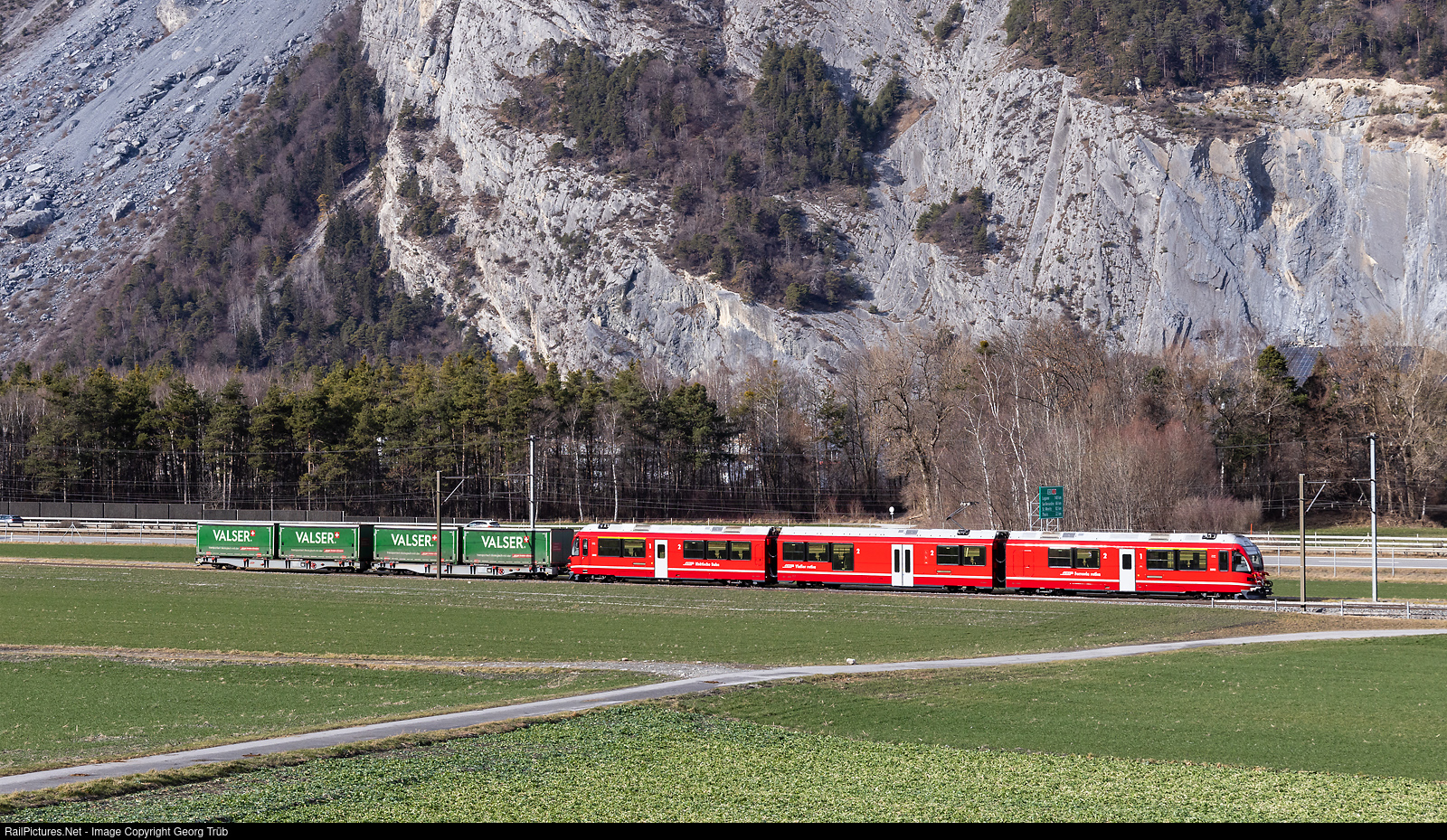 | The "Allegra" railcars ABe 8/12 of the Rhaetian Railway are used in passenger as well as in freight services. # 3502 is pulling the VALSER mineral water train 5742 from Ilanz to Untervaz-Landquart, between Felsberg and Chur. |