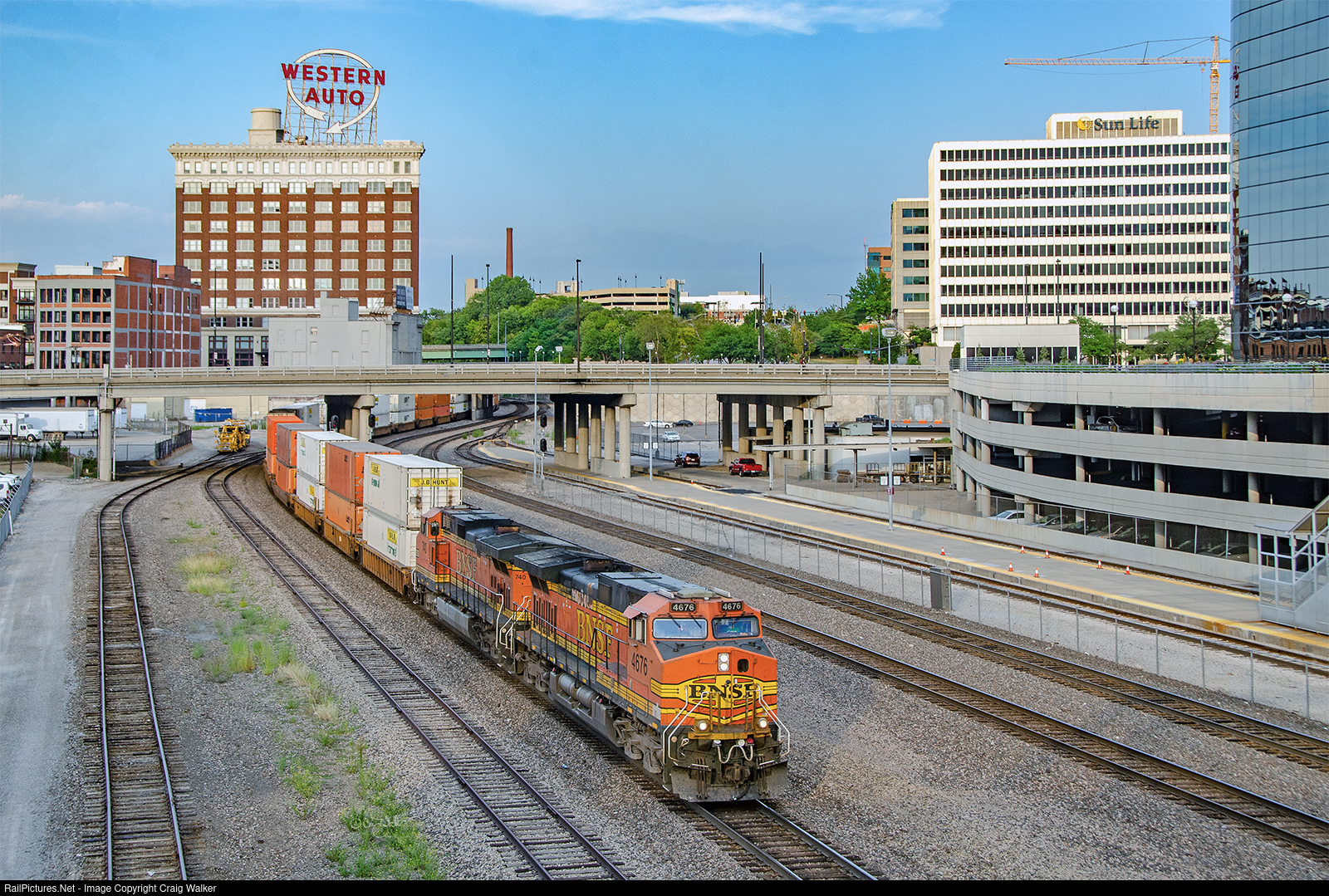 | BNSF Dash 9-44CWs 4676 and 470 bring train Q-CHIPHX6-07 through downtown Kansas City (as if you couldn't tell from the iconic Western Auto sign). This Guaranteed Service Intermodal train is heading from Chicago IL to Phoenix AZ. (Kansas City, Missouri – August 8, 2018) |