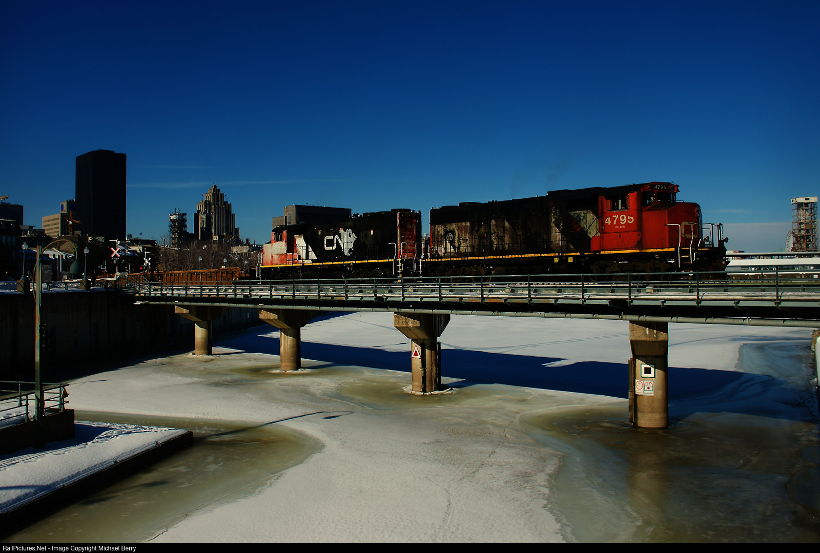 | In an uncommon move, CN 500's power is shoving towards Port of Montreal trackage, with CN 4795 & CN 9523 providing the power as it crosses the eastern end of the Lachine Canal. |