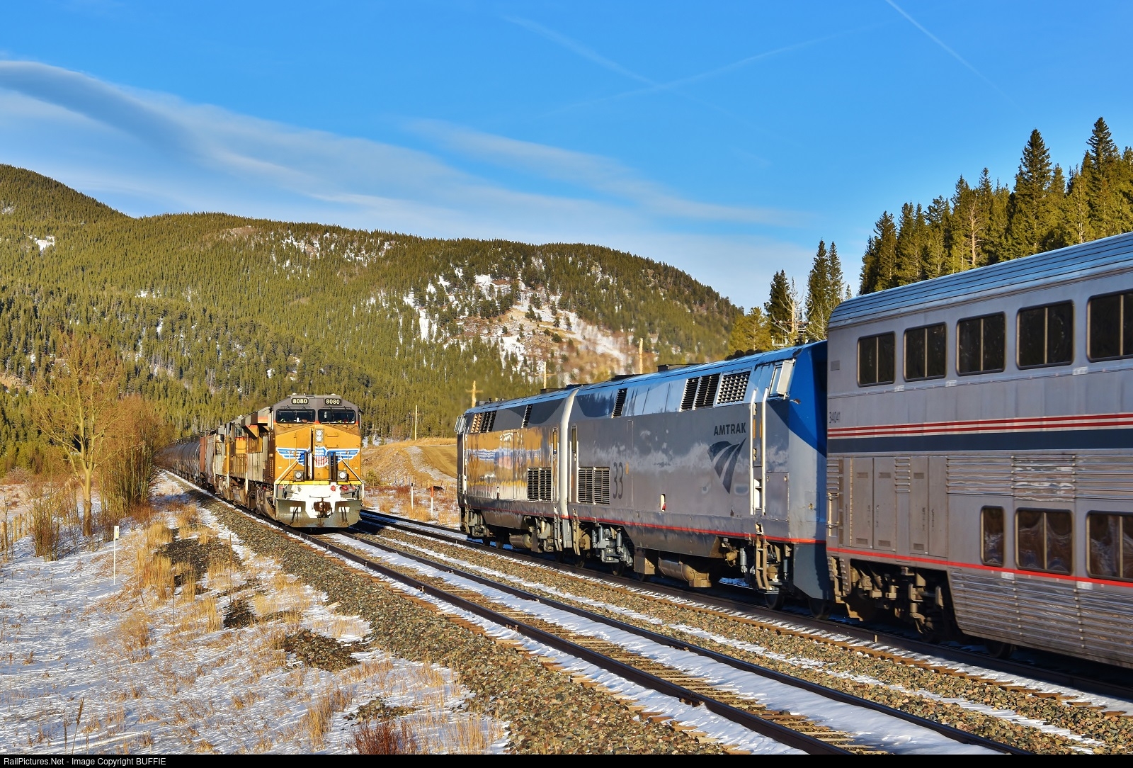 The Winter Park Express Ski Train meets a Union Pacific oil can train at Tolland, Colorado as it heads back to Denver with a load of tired skiers, hikers and snowboarders.