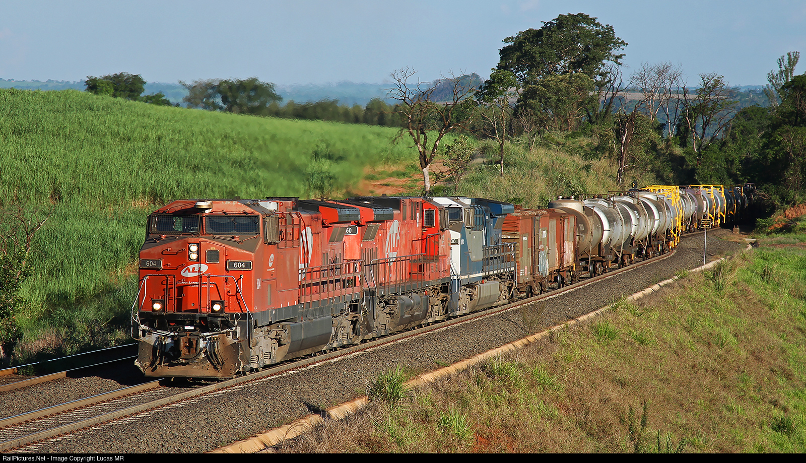 | Northbound ethanol train T51, led by AC44i #604 still wearing ALL scheme, arriving in Ouro yard. |