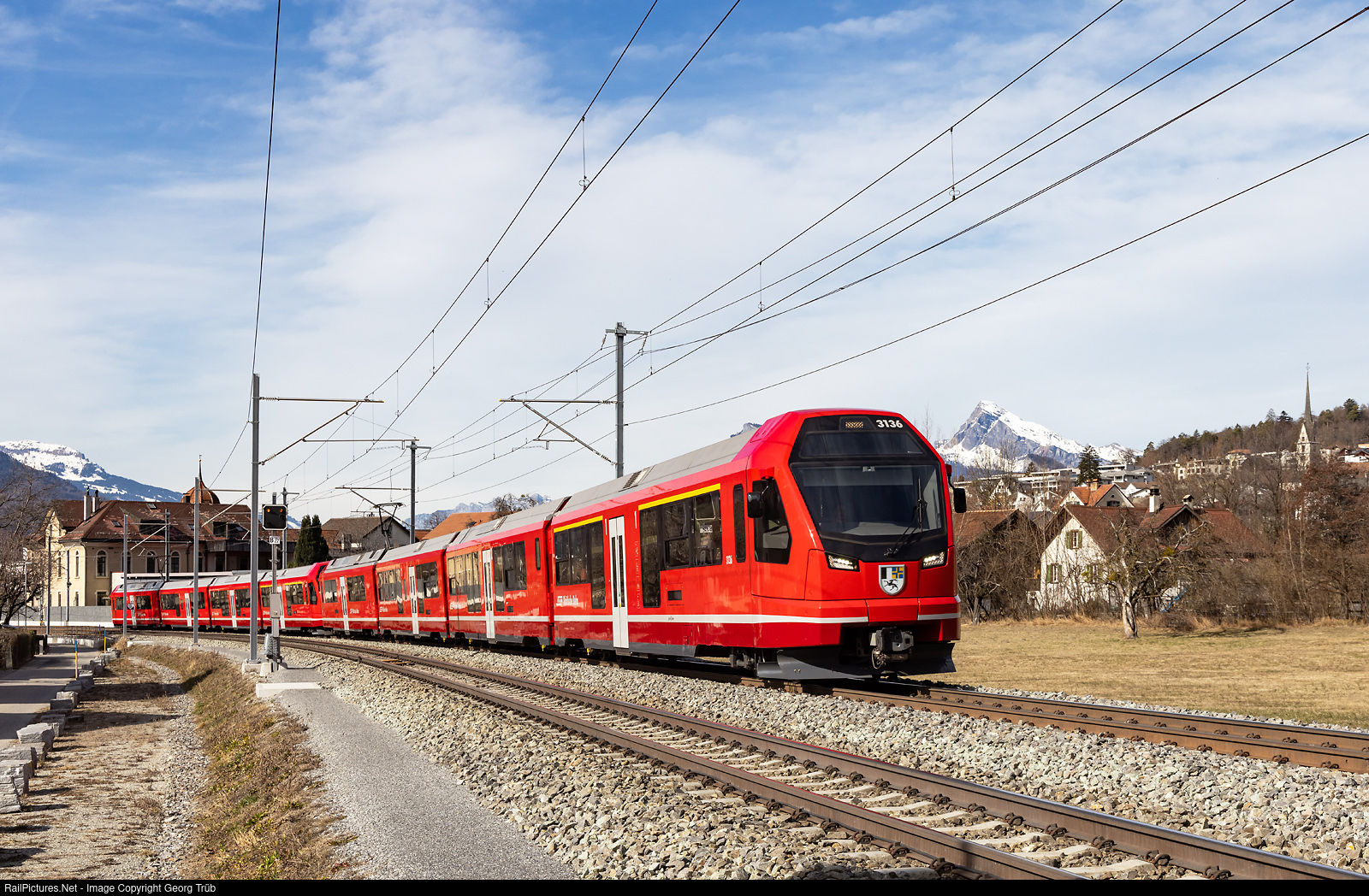 | "Capricorn" trains ABe 4/16 # 3136 and # 3120 of the Rhaetian Railway in multiple control are leaving Malans with the RE 1041 from Landquart to Davos Platz. |