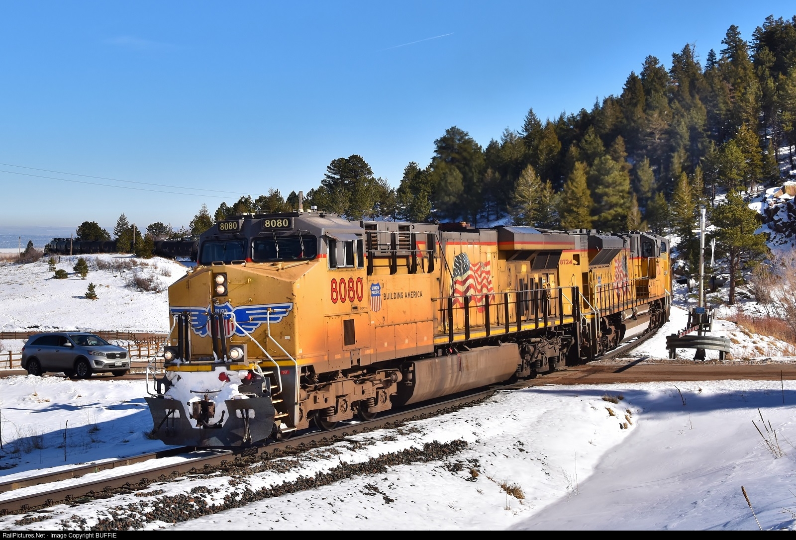 UP 8080 (AC45CCTE) leads an oil can train over Blue Mountain Road as it enters Coal Creek Canyon, Colorado.